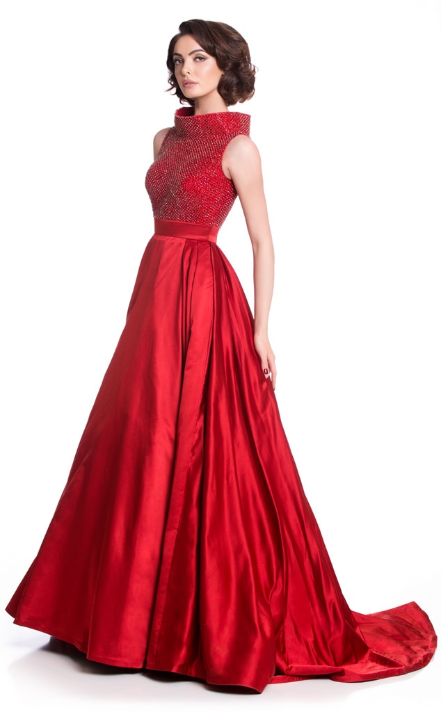 Untaian beads pada long dress dengan aksen train & slit, tampak indah.